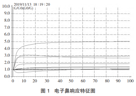 精確稱取茯苓粉2.0g,放入200mL頂空取樣杯中,檢測(cè)后密封。在室溫下重復(fù)測(cè)量5次。預(yù)采樣階段5s后,電子鼻測(cè)量時(shí)間設(shè)置為100s,沖洗時(shí)間為60s。腔內(nèi)流速為300mL·min-1,初始注射流速為300mL·min-1。這10個(gè)電子鼻傳感器的響應(yīng)曲線如圖1所示。在測(cè)量過程中,各傳感器的響應(yīng)值在70s后逐漸增大,然后趨于穩(wěn)定,因此提取80s的信號(hào)作為原始數(shù)據(jù)。