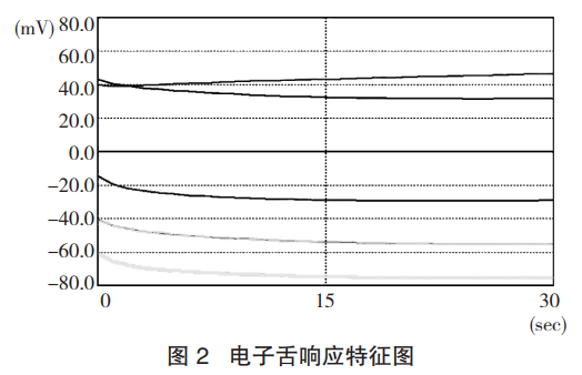精確稱取茯苓粉2.0g,用100mL純凈水溶解,回流提取1h,得到濾液,冷卻過濾。取30mL濾液到電子舌專用燒杯中。電子舌傳感器和參考電極在安裝前應(yīng)在激活液中激活24h。隨后,在測(cè)量過程中使用基準(zhǔn)液校正使數(shù)據(jù)穩(wěn)定。所有樣品在25℃室溫下測(cè)定,以基準(zhǔn)液作為清洗液。在1r·s-1攪拌速度條件下,傳感器持續(xù)清洗120s后測(cè)量30s。如圖2所示,每個(gè)傳感器的響應(yīng)信號(hào)直到15s時(shí)穩(wěn)定,因此提取30s時(shí)的響應(yīng)值進(jìn)行進(jìn)一步分析。