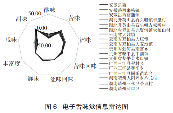 不同于以往人們對(duì)茯苓滋味的認(rèn)識(shí),茯苓樣品除咸味、酸味外,其他的味覺屬性基本都在無味點(diǎn)以上,說明茯苓具有豐富的味覺信息。茯苓最突出的味道是甜味和苦味。另外,不同產(chǎn)地茯苓的某些味覺屬性在雷達(dá)圖上重疊度較低,如酸味、澀味和苦味的回味,但各個(gè)產(chǎn)地的樣品酸味響應(yīng)值在無味點(diǎn)-13以下,見圖6。