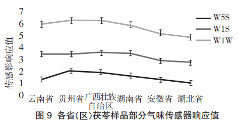 從茯苓氣味的PCA分析結(jié)果可知,在地理位置上以長(zhǎng)江為分界點(diǎn),能有效區(qū)分長(zhǎng)江以北和長(zhǎng)江以南的茯苓樣品。云南、貴州、廣西、湖南的樣品生長(zhǎng)和采收于長(zhǎng)江以南,湖北和安徽的樣品生長(zhǎng)和采收于長(zhǎng)江以北。根據(jù)雷達(dá)圖可知,W5S、W1S和W1W傳感器響應(yīng)值較高,Loadings分析結(jié)果顯示茯苓氣味的差異主要來源于無機(jī)硫化物、有機(jī)硫化物、甲基類化合物和氮氧化合物。因此選擇對(duì)上述氣味靈敏的傳感器進(jìn)一步分析茯苓氣味的產(chǎn)地差異,結(jié)果如圖9所示,安徽和湖北的茯苓樣品氣味響應(yīng)值顯然低于云南、貴州、廣西、湖南的樣品,說明長(zhǎng)江以北和長(zhǎng)江以南的樣品在無機(jī)硫化物、有機(jī)硫化物、甲基類化合物和氮氧化合物氣味成分上存在較大差異。