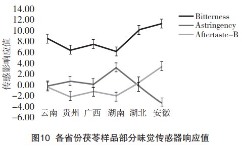 茯苓味覺信息的雷達(dá)圖分析可知,茯苓甜味顯著,但各產(chǎn)地之間差異不顯著。各產(chǎn)地的茯苓樣品味覺值的差異主要集中在苦味、澀味和苦味的回味上。因此,選擇苦味、澀味、苦味的回味進(jìn)行分析探討產(chǎn)地之間的差異,結(jié)果如圖10所示。由圖可知,湖北和安徽的茯苓樣品苦味和苦味的回味都顯著高于長(zhǎng)江以南——云南、貴州、廣西、湖南的茯苓樣品,且湖北和安徽的茯苓樣品苦味的回味在無味點(diǎn)0以上,長(zhǎng)江以南的樣品苦味的回味都在無味點(diǎn)以下。對(duì)于澀味,長(zhǎng)江以北的茯苓澀味在無味點(diǎn)以下,而長(zhǎng)江以南的茯苓澀味都在人的無味點(diǎn)以上。